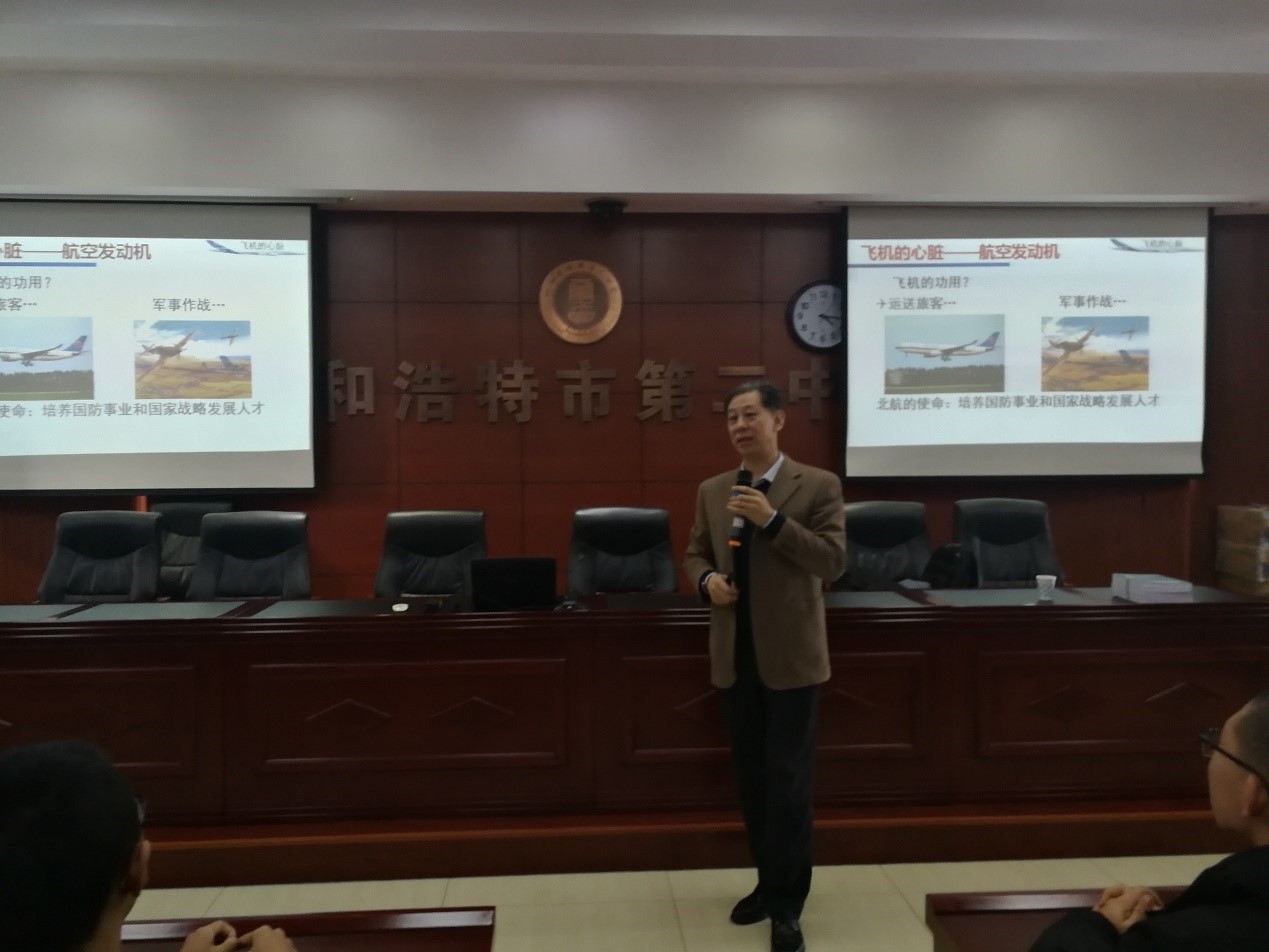 2018年12月6日,北航内蒙古招生组一行前往呼和浩特第二中学开展“教授进中学”活动。北航内蒙古招生组副组长(人文社会科学公司党委副书记)张驰老师邀请能源与动力工程公司博导教授陈志英老师作为特邀嘉宾出席本次活动。