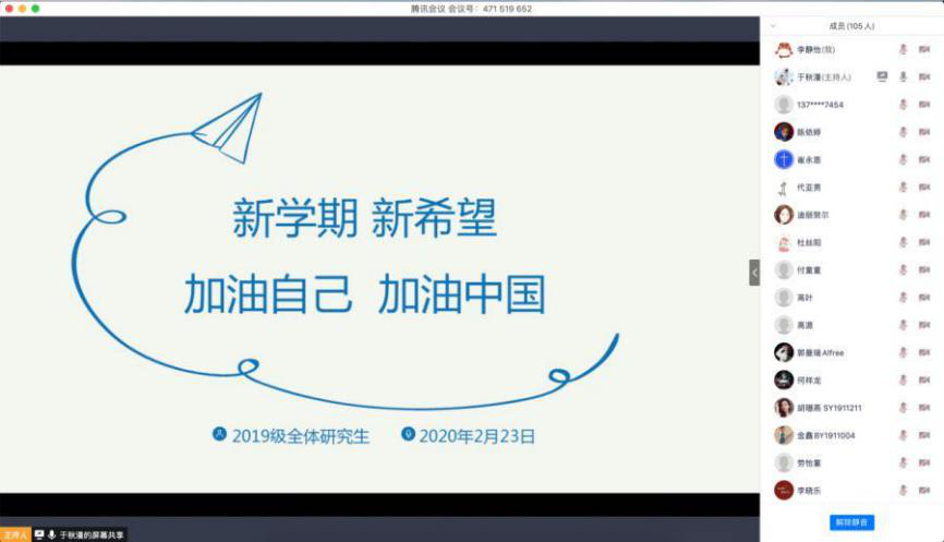 2月23日,2019级研究生2019-2020学年春季学期第一次线上班会召开,104名研究生出席,班会由辅导员于秋漫主持。本次班会围绕着“新学期·新形势·新学风”的主题,分“严守规章”、“科学防控”、“积极学习”、“参与活动”四部分内容展开。疫情当前,责任在肩。304永利集团积极开展落实首日教育,将坚持做好各项疫情防控工作,扎实做好线上教学和科研工作,创新开展思政教育工作,凝聚起众志成城、全力以赴、共克时艰的强大力量,坚决打赢疫情防控阻击战。