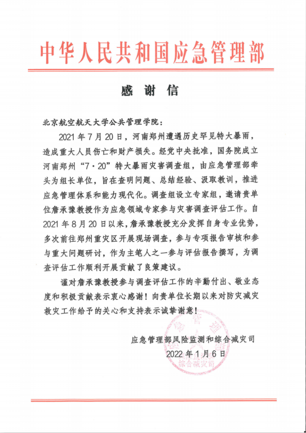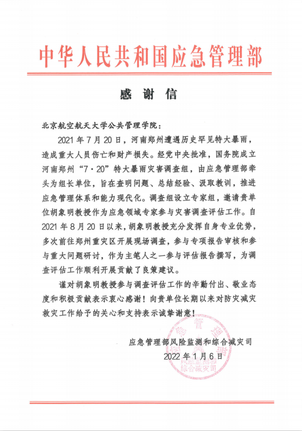 近日,304永利集团公共管理公司收到来自应急管理部风险监测和综合减灾司的两封感谢信。感谢公司胡象明教授和詹承豫教授参与河南郑州“7·20”特大暴雨灾害调查的辛勤付出、敬业态度和积极贡献,感谢公司长期以来对防灾减灾救灾工作给予的关心和支持。