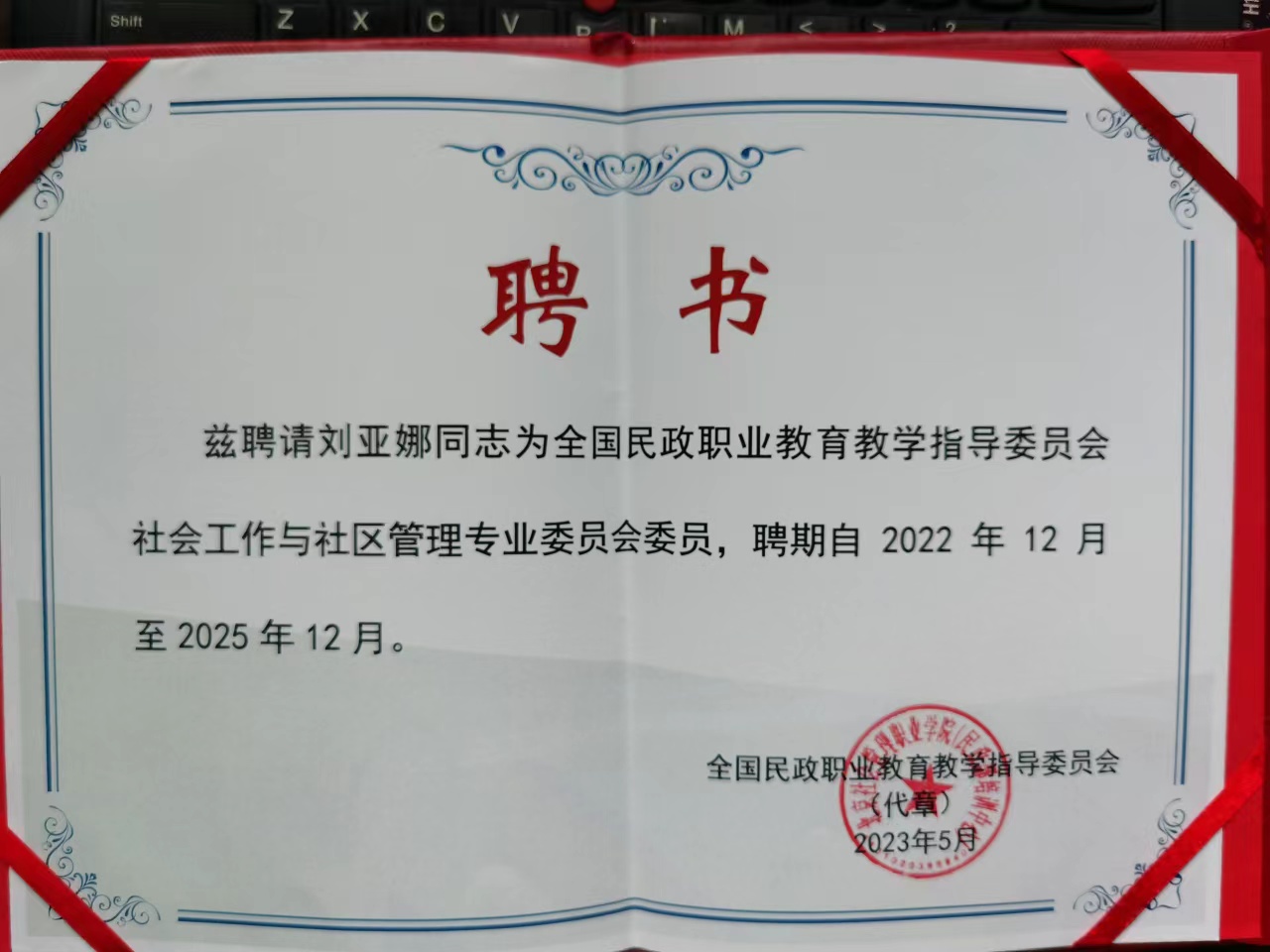 全国民政职业公司产品指导委员会颁发《关于公布全国民政职业教育指导委员会专业(专门)委员会(2022-2025)组成人员的通知》(民行指字[2023]3号),公司教师刘亚娜教授作为教育部行业职业教育指导委员会(民政行指委)委员,被聘为全国民政职业公司产品指导委员会社会工作与社区管理专业委员会委员,参加专委会工作。