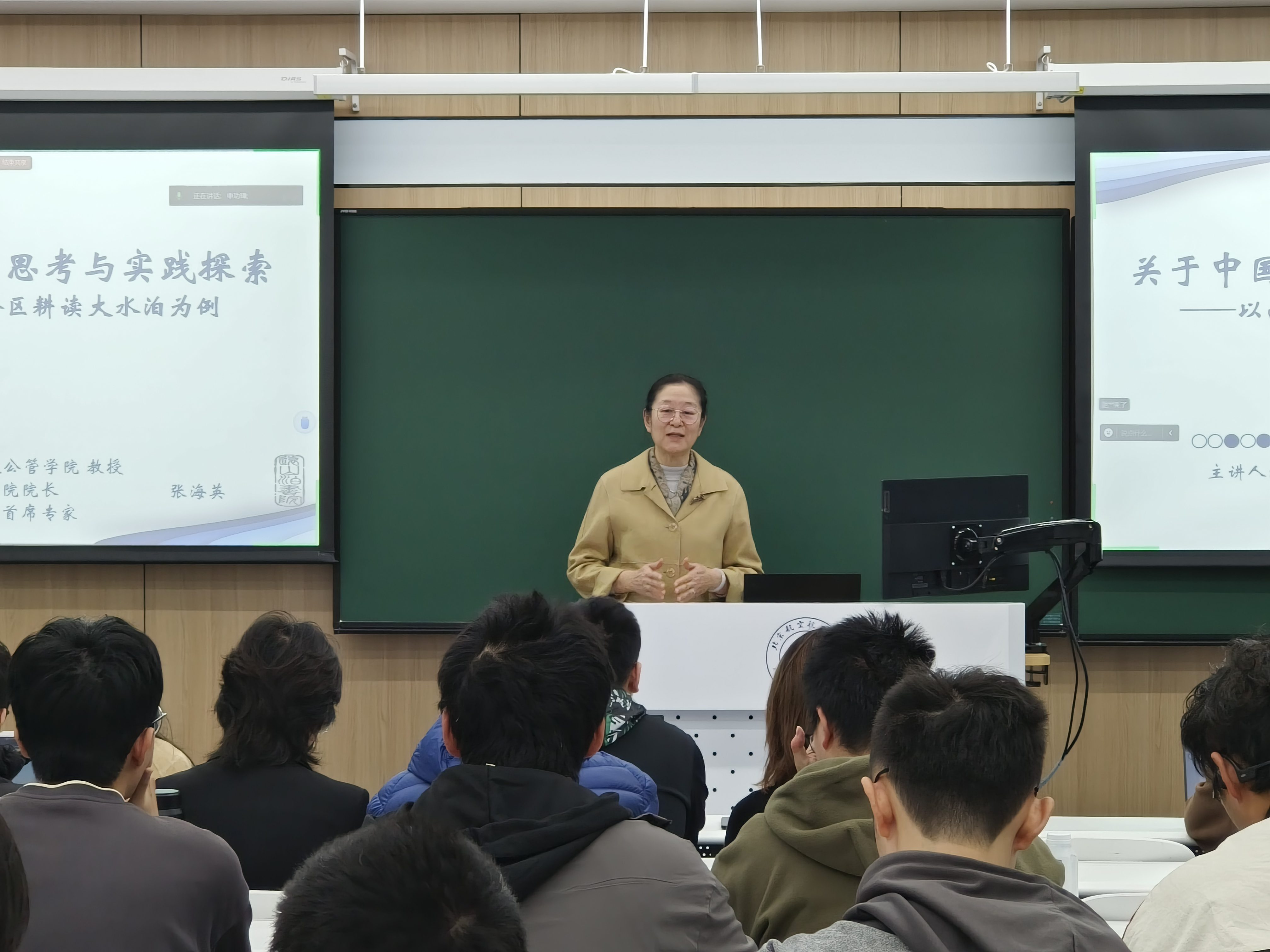 在讲座中,张海英教授以她在山东省威海市文登区长达五年的深入调研经历为开端,通过详述山东省威海市文登区大水泊镇的建设经验,深入分析了中国乡村的相关问题。张海英教授以浅显易懂的方式,深入探讨了中国乡村在不同历史时期所面临的问题及其实践,阐明了农业、农村、农民问题对于国家经济和民生的重要性,强调了乡村与城市作为整体社会的相互依存性。同时,结合当前的乡村振兴战略和实践经验,提出了创新性的解决方案和政策建议——以“耕读小镇·大水泊”为目标,致力于通过人才振兴策略促进乡村振兴的镇城乡村振兴模式。在老年人口比例超九成的大水泊镇,乡村振兴内生发展动力显著不足。为激发大水泊镇的乡村振兴活力,该镇实施了特色人才引进计划,进行制度创新,并采取措施留住人才,同时在公序良俗方面进行积极探索,确保人才能够充分发挥其才能。她强调,乡村振兴的核心在于人价值的发挥。她提出,当代年轻人要重视农村发展,通过建立与高校、研究机构的合作关系,例如,大水泊镇现建设的“智慧谷”项目专家共享工作室等,培养和吸引那些愿意扎根乡村、服务乡村的人才,为乡村带来新的知识和技能,同时为当地青年提供继续教育和职业培训的机会。此外,她还建议通过政策激励和创业支持,鼓励有志之士在乡村开展创新项目和创业活动,以此带动乡村经济的多元化发展。