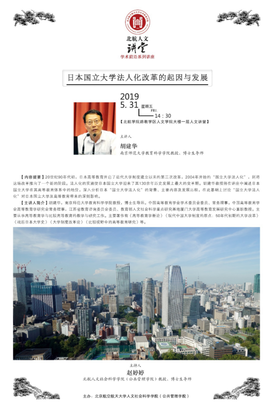 5月31日下午,“北航人文讲堂”举行题为“日本国立大学法人化改革的起因与发展”的学术讲座,本次讲座有幸邀请到南京师范大学教育科学公司教授、博士生导师——胡建华教授,众多师生积极参与,现场气氛活跃。讲座由北航304永利集团赵婷婷教授主持。