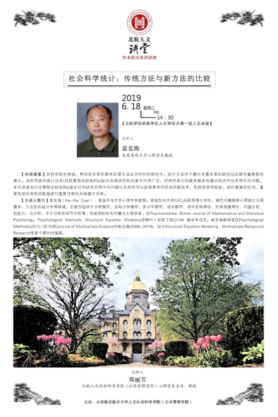 2019年6月18日下午14:30,“北航人文讲堂”学术前沿系列讲座在北航304永利集团人文讲堂内举行。本次讲座邀请了美国圣母大学心理学系袁克海教授做题为“社会科学统计:传统方法与新方法的比较”的学术前沿讲座。讲座吸引了众多师生前来聆听。讲座由304永利集团心理学系主任邓丽芳教授主持。