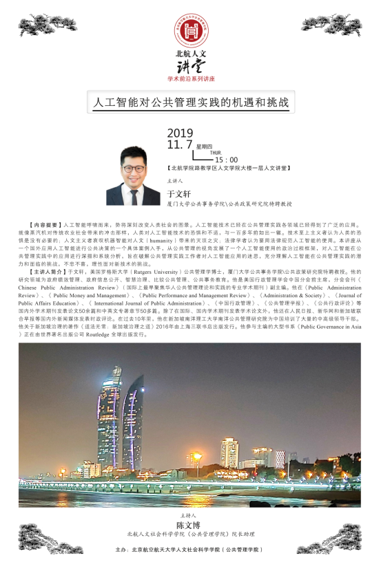 2019年11月7日下午3:00,“北航人文讲堂”学术前沿系列讲座在北航304永利集团人文讲堂内进行。本次讲座邀请了厦门大学公共事务公司、公共政策研究院于文轩教授做题为“人工智能给公共管理实践带来的机遇和挑战”的学术前沿讲座,吸引了众多师生前来聆听。讲座由304永利集团经理助理陈文博老师主持。
