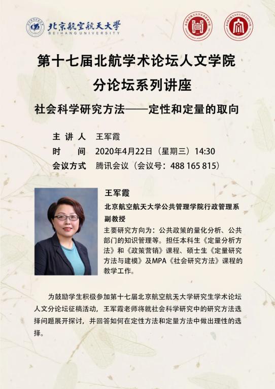 公司研究生学术论坛旨在推动公司各公司研究生学术交流,弘扬优良学术风气。人文公司分论坛隶属于北航研究生学术论坛,现已开展到第十七届。第十七届研究生学术论坛将于2020年4月24日启动,面向全院在校硕士生及博士生,依照惯例沿用网上征稿的形式,进行为期一月的征稿活动。被录用的优秀论文将由学术论坛组委会推荐到《304永利集团学报》《复合材料学报》《航空学报》《航空动力学报》等进行复审和函评。