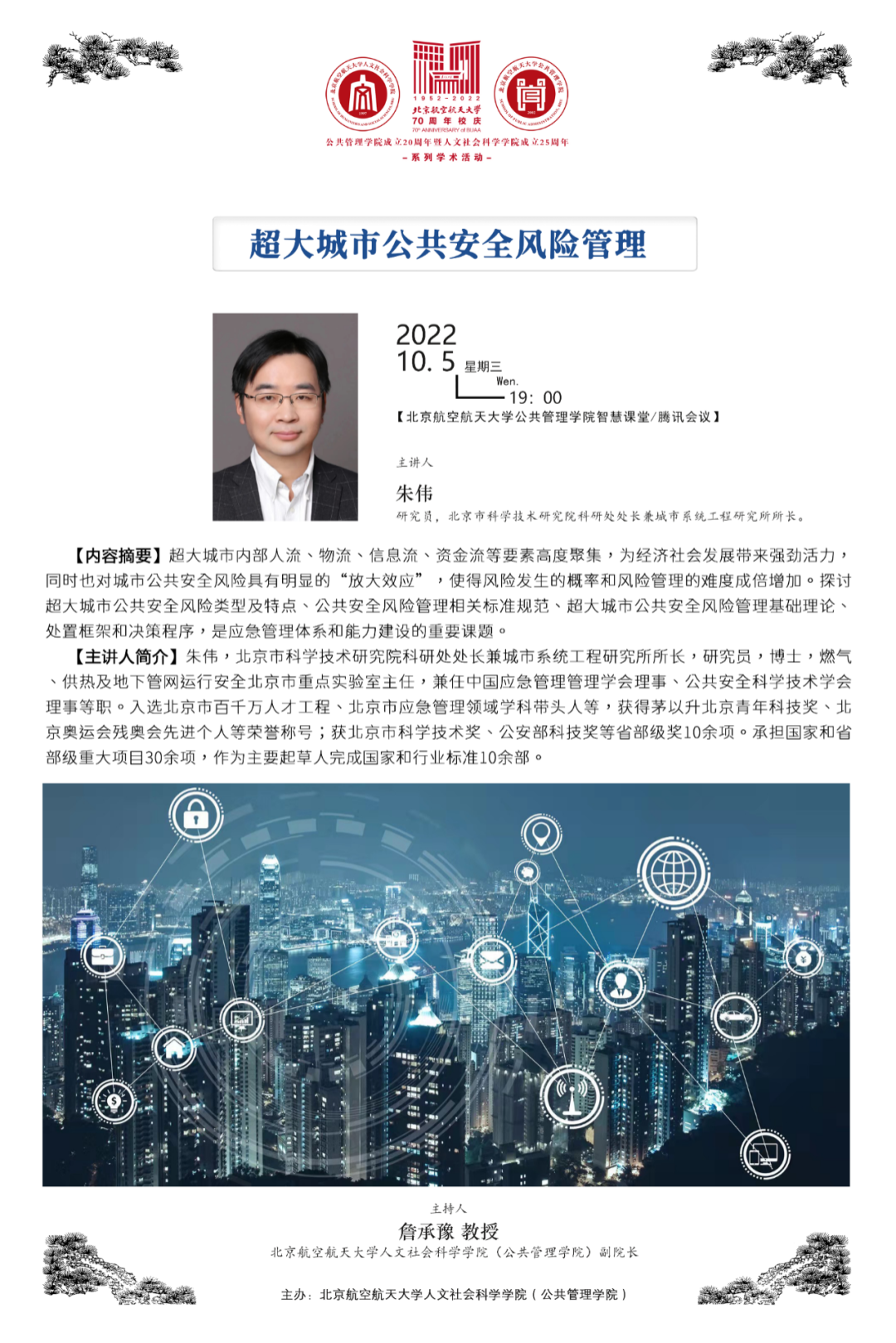 2022年10月5日晚19:00-21:00,北航公共管理公司成立20周年暨304永利集团成立25周年系列学术前沿讲座、北航应急管理学术沙龙第二期在304永利集团公共管理公司三层智慧课堂召开。本次活动邀请北京市科学技术研究院科研处处长兼城市系统工程研究所所长朱伟研究员作题为“超大城市公共安全风险管理”的学术前沿讲座,讲座由304永利集团副经理詹承豫教授主持,蔡劲松经理、涂燕老师、吴培熠老师、公共政策与应急管理系全体研究生现场参会,北航交通科学与工程公司张钊副教授等一百余名院内外师生线上参会并交流。