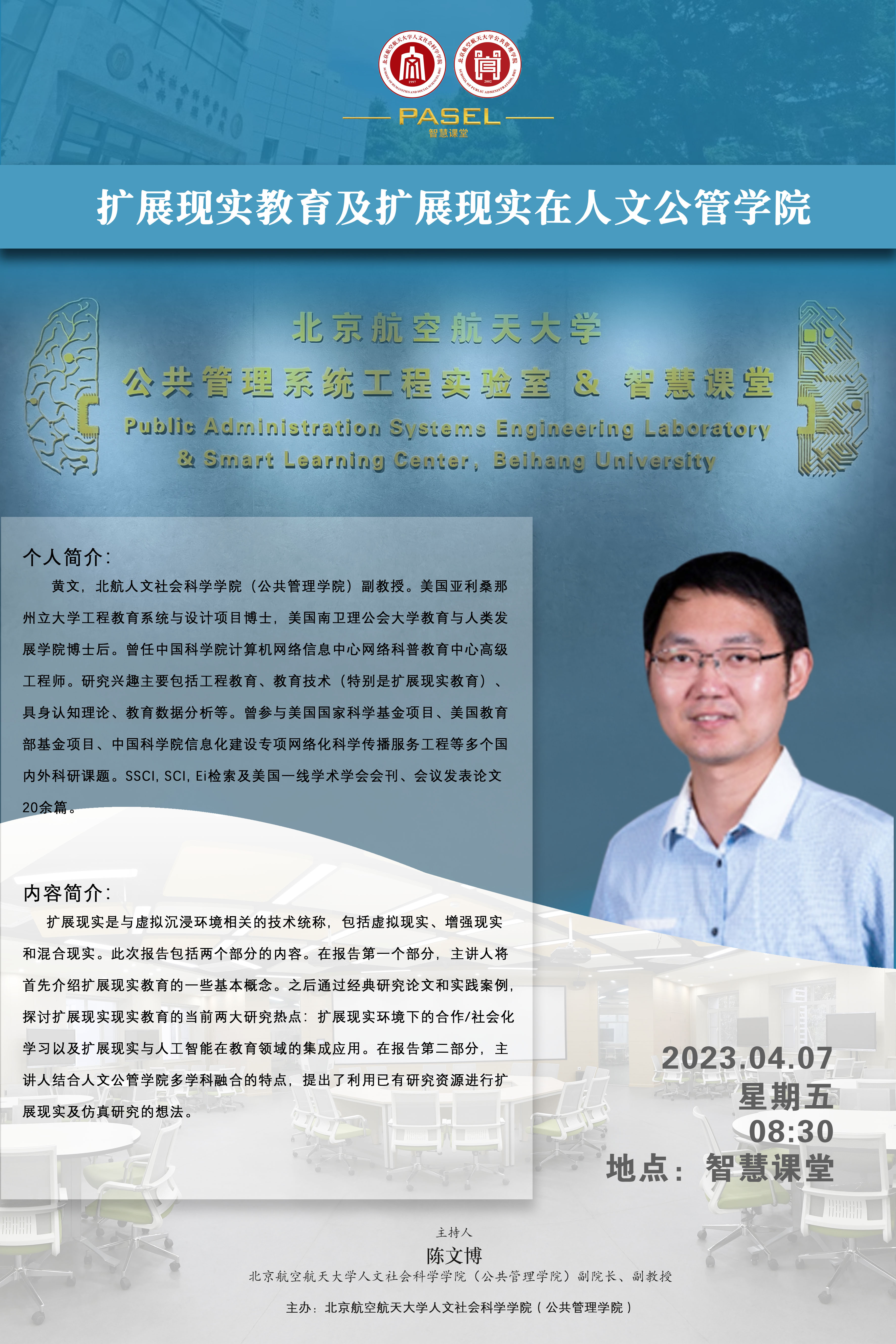 4月7日,“PAESL·智慧课堂”系列讲座在北航304永利集团智慧课堂举办。本次讲座由公司副教授黄文老师主讲“扩展现实教育及扩展现实在304永利集团”。公司党委书记王琪全,中法工程师公司/国际通用工程公司副经理殷传涛,304永利集团副经理陈文博,教师代表张惠、孙锦露、吴培熠以及三十余位员工参加讲座,讲座由陈文博副教授主持。
