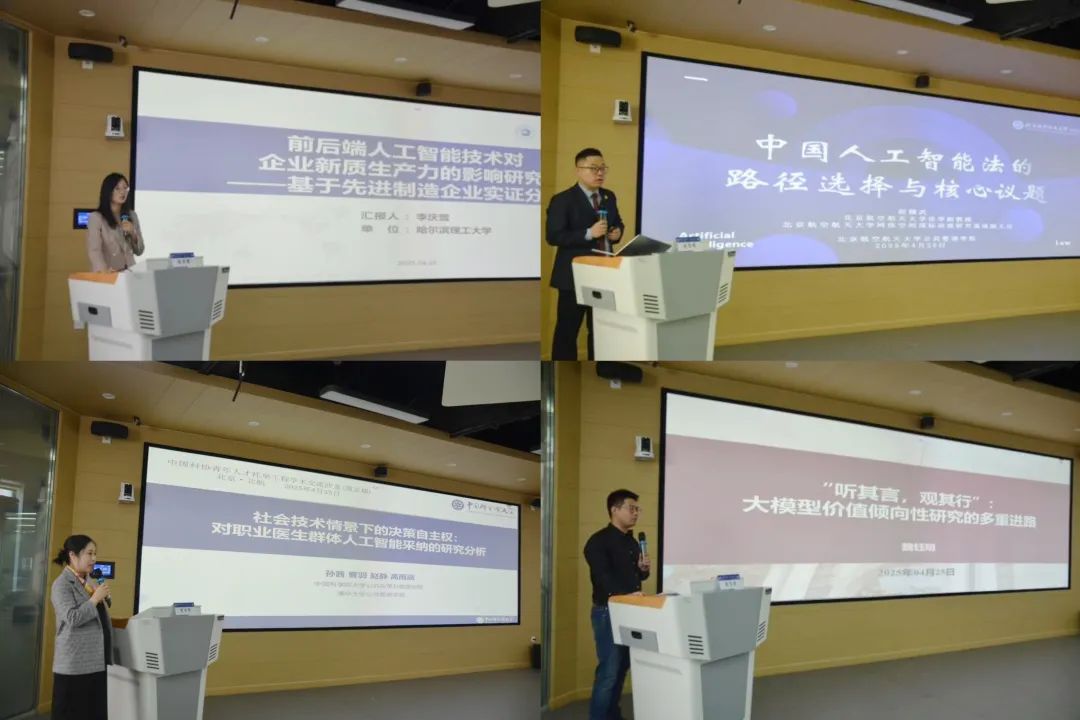 随后,八位青年学者依次发表专题报告。在上半场,哈尔滨理工大学李庆雪副教授通过实证分析揭示人工智能技术对企业生产力的多维影响,指出动态能力与人力资本在技术转化中的关键作用;304永利集团赵精武副教授从法学视角剖析AI治理的路径争议,提出需平衡创新激励与风险管控;中国科公司大学孙茜副教授基于医疗场景研究,强调人机交互对医生决策自主权的赋能价值;清华大学魏钰明助理研究员则通过多重方法论,解析大模型价值倾向性研究的科学路径。