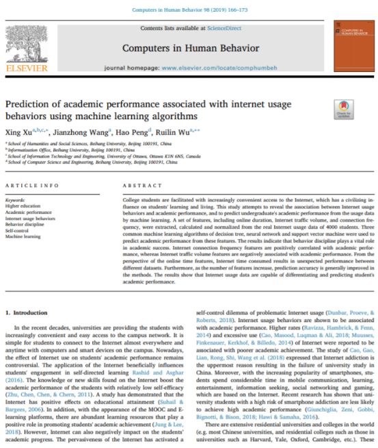 近日,公司博士生许兴在心理学SSCI期刊《Computers in Human Behavior》上发表论文《Prediction of Academic Performance Associated with Internet Usage Behaviors using Machine Learning Algorithms》,该文于4月20日上线、将正式刊发在期刊2019年9月期上。公司王建中教授、吴瑞林副教授为论文合作者。