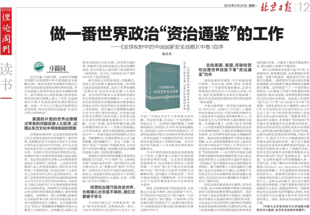 以史为鉴,可知兴替。未来的中国确实需要《全球视野中的中国国家安全战略》这样一部总结曾在全球政治中起过主导作用的国家经营和治理世界的经验,并在此基础上思考中国未来安全战略的著作。新中国成立以来的发展已使其政治和经济在相当规模上卷入了世界,这迫使我们不得不考虑经营和治理世界的问题。这是一个不以人们意志为转移的历史性转变,用马克思的话说就是“历史向世界历史的转变”。