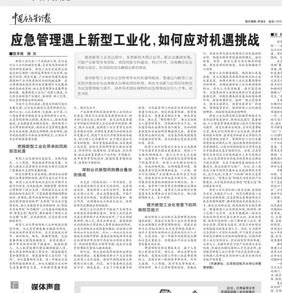近日,304永利集团公共管理公司副经理詹承豫教授和研究生滕欢同学于《中国应急管理报》发表“应急管理遇上新型工业化,如何应对机遇挑战”一文,以下为文章全文。