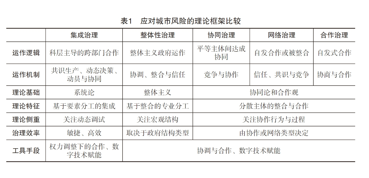 在应对城市风险这一议题上,与整体性治理类似的理论解释还有协同治理、网络治理和合作治理。整体性治理强调整体基础上的分工逻辑,关注跨部门的协调、整合与信任。协同治理、网络治理和合作治理以协同论和合作观为基础,注重分散主体的整合和合作,但无法保证敏捷高效的治理结果。集成治理立足科层主导的跨部门合作,认为化解城市风险需要以动态化的视角整合多种治理要素,呈现出动态性、整体性和技术赋能等多重表征,这一理论路径能够弥补既有学理分析的不足,实现理论分析框架的创新。应对城市风险的几种理论框架的比较见表 1。