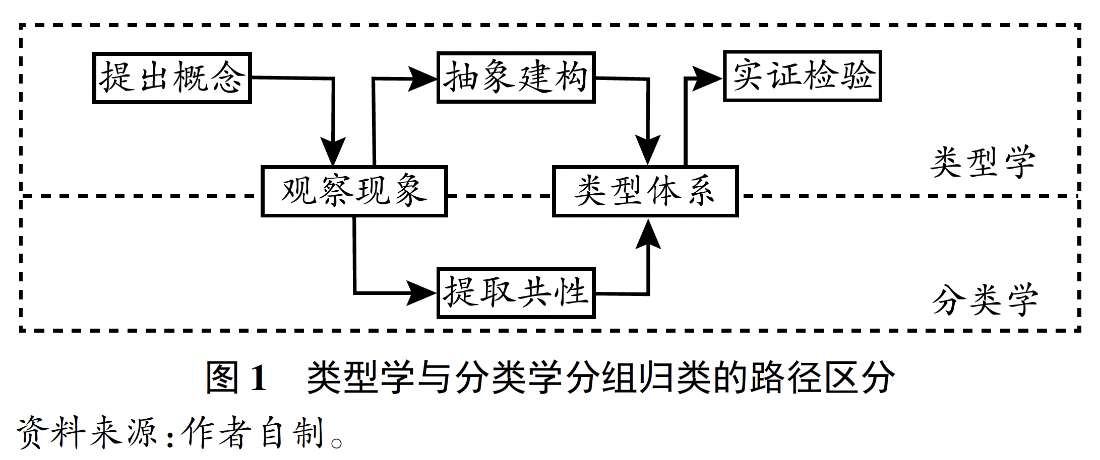 分类学(Taxonomy)是基于可观测和可测量的经验性特征来区分项目,[18]在观察方法上,根据实践经验和量化数据对研究对象进行精准化分类及归类,其本质属于普通描述性归纳。此方法通常用于自然科学中的生物学,根据自然属性分类,将观察对象归入界、门、纲、目等内容。具体步骤是找出已经存在的研究对象的重要特征或划分标准,层层抽象,将具有相同或相似重要特征的对象归为一类。类型学的经典研究范式是理想类型法,需要研究者做一个基于现实、接近典型的理想化主观建构,超越现实和主观感受,这要求研究者必须保持价值中立才得以确保划分的理性与纯粹;研究者的建构必须在逻辑上有一致性,为案例的比较提供内在逻辑框架,不能违反经验的因果关系,尽量避免理想概念与现实世界的脱节、冲突与矛盾。[19]研究者以理想概念对标现实社会,审视现实与概念之间的差距,并对这种差距做出因果解释。可见,类型学用于探索事物发展规律与变迁,在概念体系建构之后往往需要进行实证。图1对比了类型学与分类学搭建框架的不同路径,可见类型学相较于分类学更加凸显人的主观抽象能力。