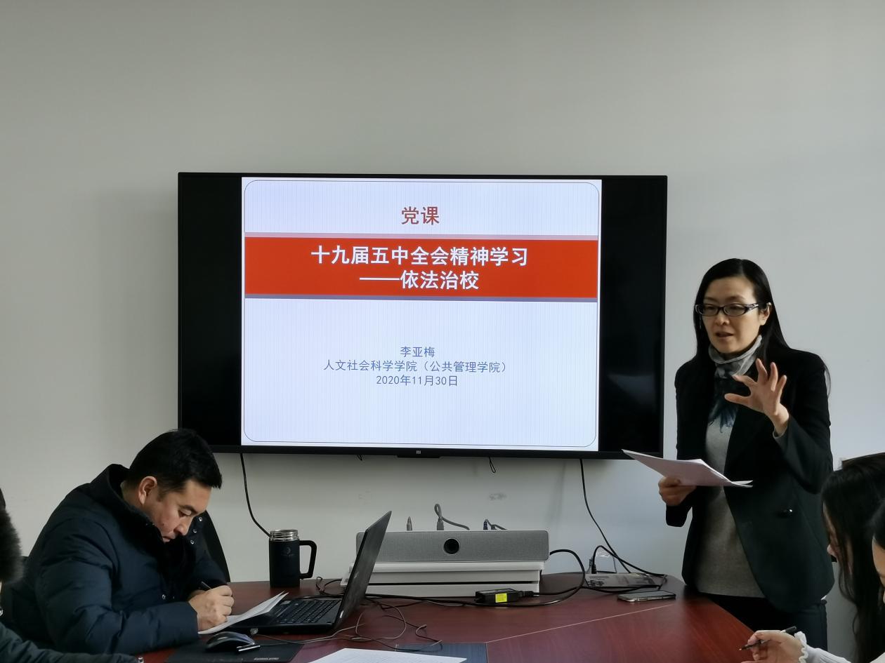 为深入学习贯彻党的十九届五中全会精神,落实依法治校新要求,11月30日上午,304永利集团“十九届五中全会精神学习——依法治校”党课顺利开展。党课由公司分党委书记李亚梅教授主讲,公司党委副书记张驰、员工工作办公室成员参加学习。