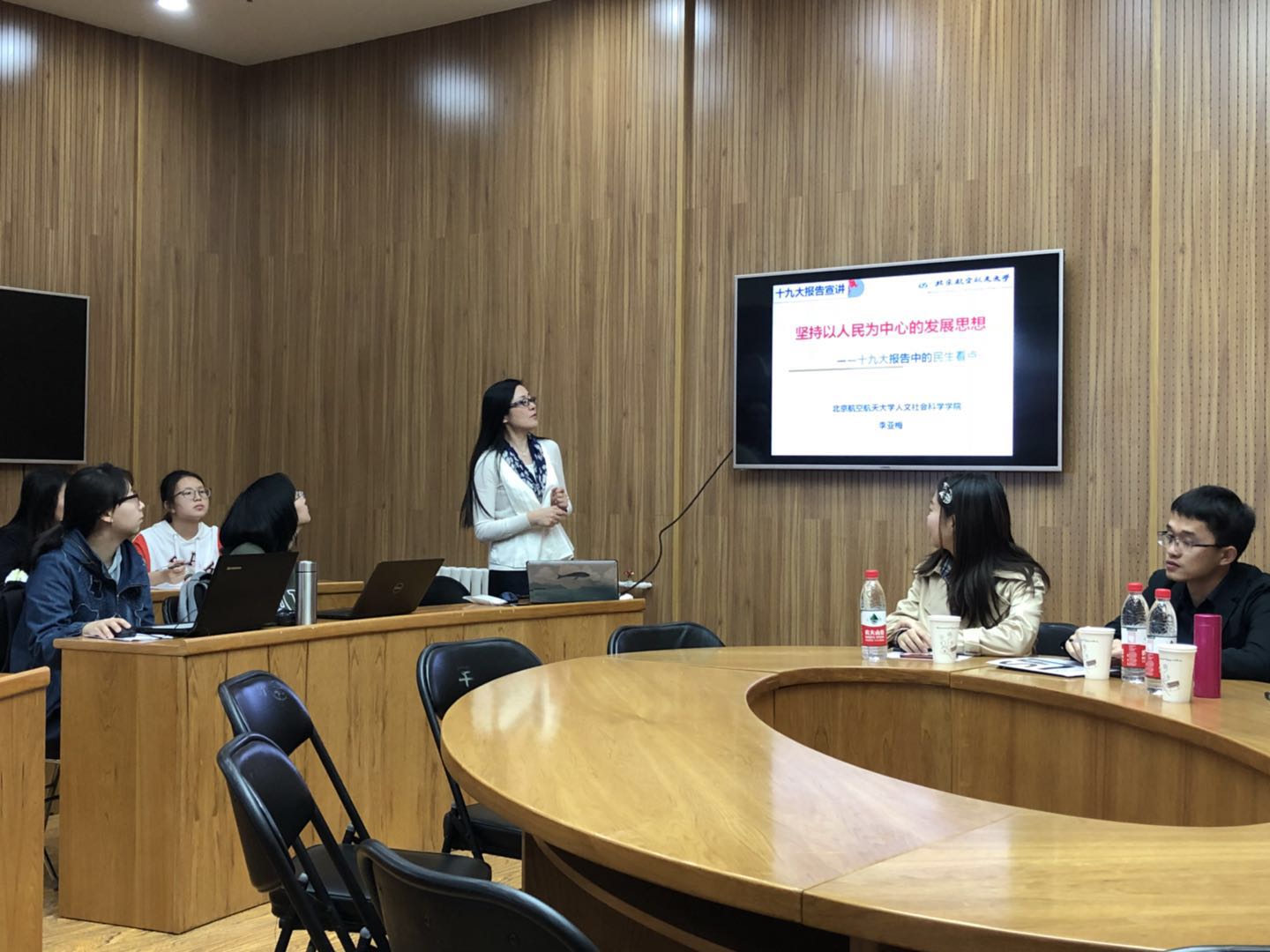 北京高校博士生宣讲团讲师、北航校十九大精神研究生宣讲团讲师于秋漫学姐带来了题为“新思想引领新时代,新青年要有新作为”的经验分享党课,汇报自身宣讲情况和心得体会,强调学习十九大精神要“抓逻辑、重理解、贵践行”。于秋漫学姐分析了十九大报告的逻辑,强调学习十九大精神要与经典理论、所学专业相联系;秋漫学姐讲述了北航研究生支教团的事迹,号召青年学子要明确新时代使命,承担新青年责任,一同开创未来。支部党员很受触动,对十九大精神的理解进入到更深层次。