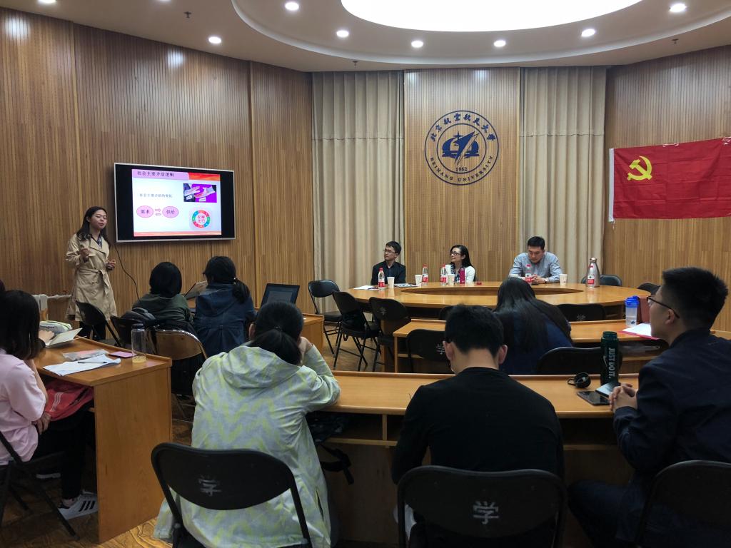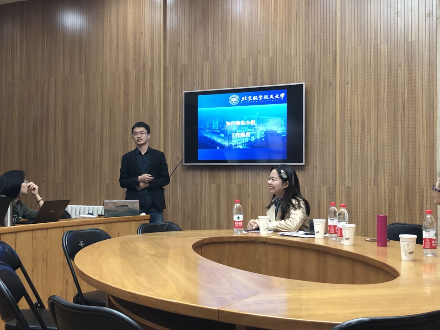随后,人文公司博士生、17级硕士辅导员刘鹏作为知行唯实小组的成员,向在座党员介绍了知行唯实小组的情况。人文院知行唯实小组是北京市“党的十九大精神-我学我讲我践行”评比出的50个“示范学习小组”‘之一,公司仅两个小组获此荣誉。截至目前,知行唯实小组已在北航校内外开展十九大精神宣讲活动30多次,受众3000余人次。刘鹏学长围绕“学”、“讲”、“行”介绍了小组开展活动的成功经验,分享了“读原著、听报告、小组研讨”的学习方法,介绍了开展研读班,赴门头沟、延庆区调研等的实践经验,为支部党员用行动实践十九大精神提供了宝贵借鉴。