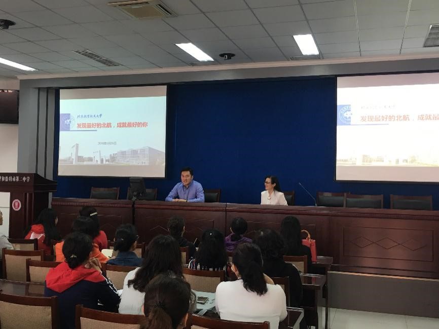 26日上午,招生组前往鄂尔多斯一中。在李振华副董事长的带领下参观了公司并重点向我们介绍了实验楼。下午,举行揭牌仪式。李亚梅老师表达了对高二同学的殷切希望。李振华副董事长作为校方代表表达了对北航的感谢,并从发展历史、学风建设、学科专业等方面向同学们介绍了北航。张驰老师深入浅出,以同学们喜闻乐见的小故事进行宣讲,展现了北航的风采魅力。揭牌仪式后,招生组三人与白玉亮董事长展开交流。