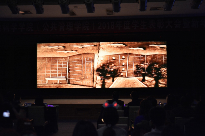 一涧飞瀑,碎琼乱玉,造就此景的不是水;一地竹影,摇曳生姿,造就此态的不是风。在严凰和辛卢娜同学空灵婉转的歌声中,沙画表演《人文的故事》在大屏幕上缓缓呈现。带我们一起回顾了公司创建和发展的历程,筚路蓝缕,以启山林;带我们重温了人文学子在公司学习和生活的日子,毓秀人文,砥砺前行。