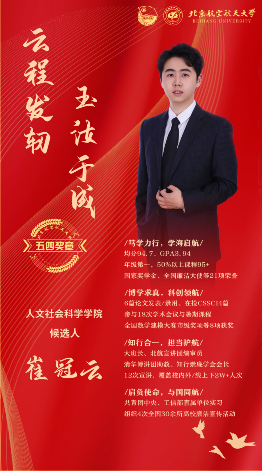 崔冠云同学扎根科研、躬身实践。学业成绩均分94.70,GPA 3.94,位列行政管理专业第1名,曾获国家奖学金、学业一等奖学金、北航优秀研究生等20余项荣誉;担任大班长、北航知行崇廉学会会长、清华大学博士生讲师团助教等职,曾于共青团中央与工信部实习,做到全面发展。