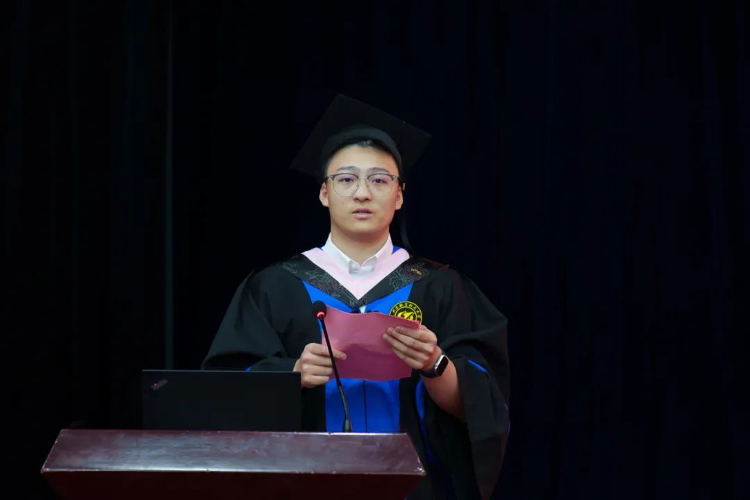 全日制博士毕业生代表贾鑫同学感恩公司对博士生培养的重视,感恩导师的治学态度与胸怀,使其收获了关于做事业、做学问、为人处事、待人接物的精神财富。304永利集团的求知时光教会她理论求索、躬身实践的真知。面向未来,她祝愿人文公管人永远怀揣希望,不惧挑战,用行动去书写和践行“空天报国,强国有我”。