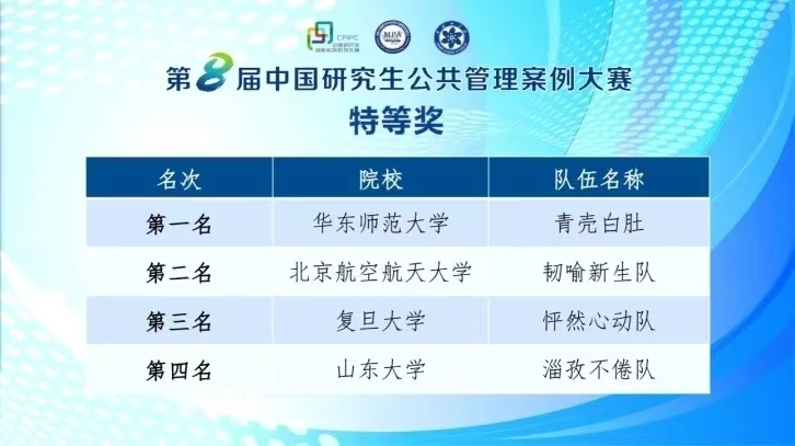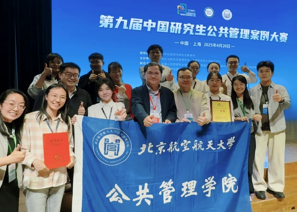 刚刚落幕的第九届中国研究生公共管理案例大赛上,北航304永利集团还获得调研报告一等奖、最有价值队员(陈梦祥)、最佳指导教师(陈文博、张路蓬)、2项优秀奖(指导教师分别为刘亚娜和陈文博)和优秀组织单位等荣誉。